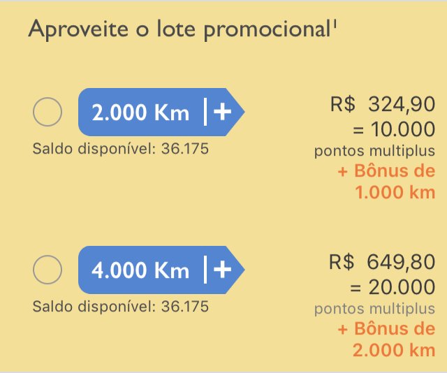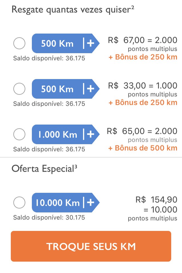 Mas como esse resgate só vale uma vez ao ano, há outras opções para troca de quilômetros para pontos Multiplus. Todo mês são lançadas promoções, por isso é bom ficar atento aos valores em quilômetros e em dinheiro. Veja nas fotos alguns exemplos: