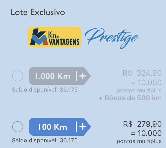 O ideal é escolher a opção que melhor cabe no seu orçamento e dentro do seu saldo em quilômetros. Os resgates podem ser pagos em até 12 vezes sem juros no cartão de crédito. Quem usa bastante o posto Ipiranga pode atingir a categoria Prestige. Para isso, precisa obter 10.000 Km elegíveis na aquisição de produtos e serviços dentro de um ano. Quem atinge essa categoria tem lotes exclusivos de resgate de quilômetros, entre outros benefícios. Veja um exemplo: